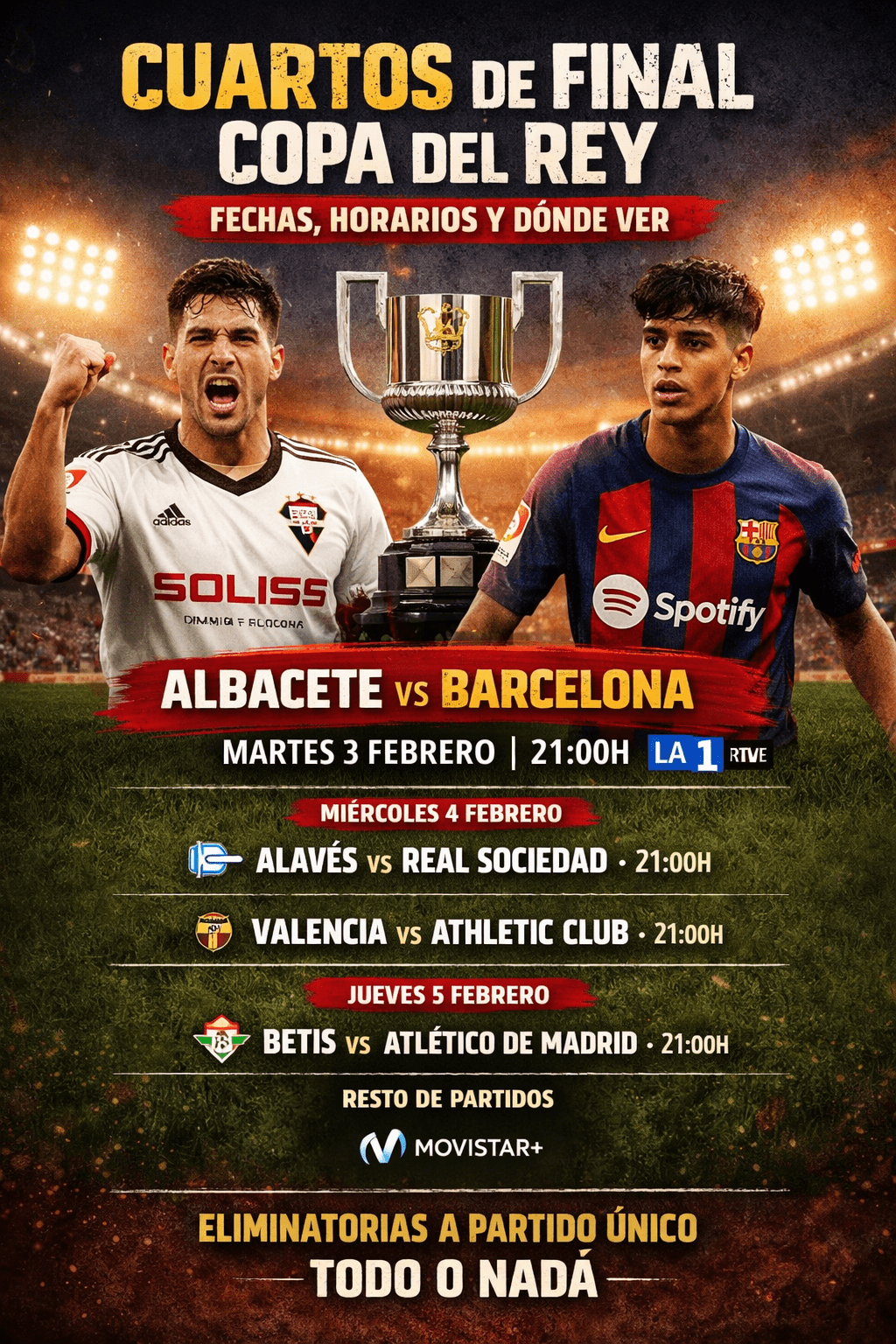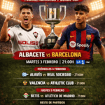 La Copa del Rey entra en su fase decisiva con los cuartos de final a partido único. Cuatro noches seguidas de fútbol del bueno, con sorpresas recientes, históricos del torneo y mucho en juego. Aquí tienes cuándo, a qué hora y dónde ver por televisión cada encuentro, con especial atención al duelo que abre fuego entre Albacete Balompié y FC Barcelona.